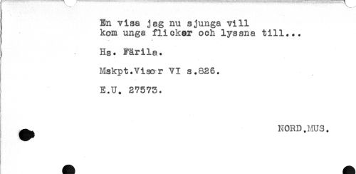 //// A ^ : //// En visa jag nu sjunga vill //// kom unga flickar och lyssna till... //// * * //// ) Hs. Färila. //// Mskpt.Visor VI s.826. //// E.U. 27573. //// f //// I ^ NORD. HUS. //// i ^^^ ////