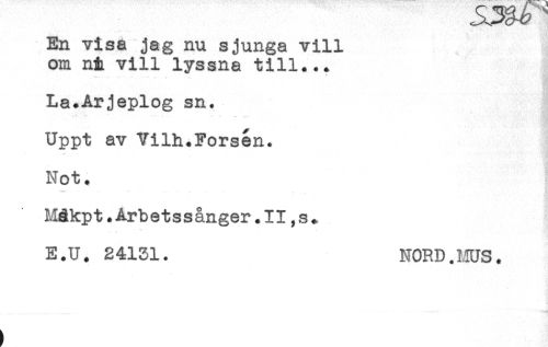 //// En visa jag nu sjunga vill //// om nt vill lyssna till... //// La.Arjeplog sn. //// Uppt av Vilh.Forsen. //// Not. //// Måkpt.Arbetssanger.II,s+ //// E.U. 24131. NORD.MUS. ////