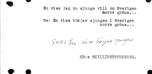 //// ! En visa jag nu sjunga vill om Sveriges //// morra gräns... //// Se: En visa börjar sjungas i Sveriges //// norra gräns... //// * //// r //// t //// jj //// } //// KB:s SKILLINGTRYCKSREG. ////
