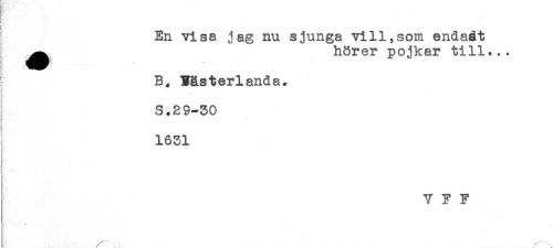 //// En visa jag nu sjunga vi 11,som endaåt //// ^^ hörer pojkar till... //// t. //// B. Tästerlanda, //// *. ^ //// S.29-50 //// 1651 //// V F F ////