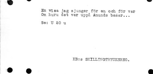 //// En visa jag sjunger för en och för var //// Om huru det var uppå Anunds basar... //// Se: U 20 u //// t; //// /! //// KB:s SKILLINGTRYCKSREG. ////