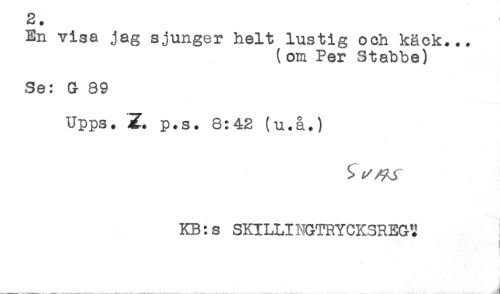 //// R. //// En visa jag sjunger helt lustig och käck... //// (om Per Stabbe) //// Se: G 89 //// Upps. Z. p.s. 8:42 (u.å.) //// KB: s SKILLINGTRYCKSREGU //// -- //// it ////
