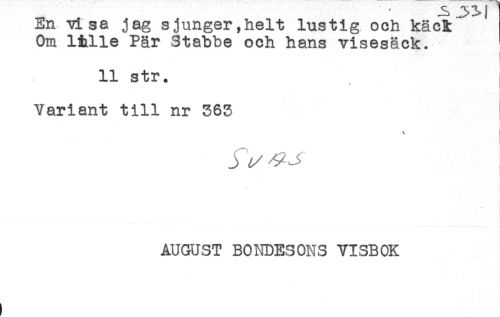 //// En vt sa jag sjunger,helt lustig och käcR //// Om linlle Pär Stabbe och hans visesäck. //// < //// j //// 11 str. //// Variant till nr 363 //// ** //// AUGUST BONDESONS VISBOK ////