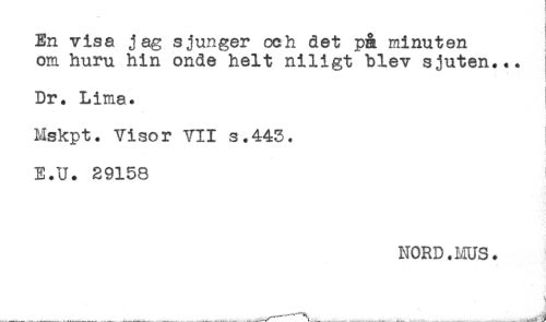 //// f //// ! //// En visa jag sjunger och det på minuten //// om huru hin onde helt niligt blev sjuten... //// Dr. Lima. //// Mskpt. Visor VII s.443. //// E.U. 29158 ! //// NORD. MUS. ////