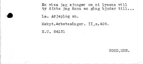 //// En visa jag sjunger om ni lyssna vill //// ! ty dikta jag ännu en gång bjuder till... //// ! ^^ La. Arjeplog sn. //// ! Mskpt. Arbetssån ger. II^s.409. //// ! E.U. 24131 //// t //// ! //// ! //// NORD.MUS. //// ___....., ... ...... .... ////