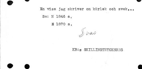 //// En visa jag skriver om kärlek och svek,,, //// Se: N 1846 a, //// - //// E 1870 s, //// f - - - //// KB:s SKILLINGTRYCKSREG //// } ////