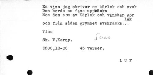 //// En visa jag skriver om kärlek och svek //// Den borde en fasa uppräcka //// Hos den som av Kärlek och vänskap gör //// lek //// och från sådan grymhet avskräcka... //// Visa //// Sk. V.Karup. - ^ ^ //// f //// 5200,18-30 45 verser. //// ^ L U F ////