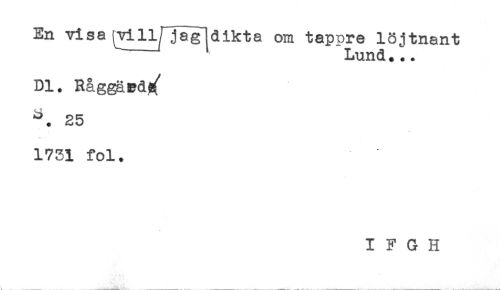 //// En visa ^vilirj^ldikta om tappre löjtnant //// Lund... //// Dl. RåggäPdef //// 25 //// 1731 fol. //// I F G H ////