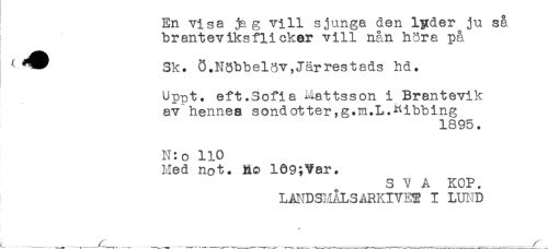 //// En visa jag vill sjunga den lyder ju så //// branteviks flickar vill nån höra på //// Sk. Ö.N3bbel3v,Järrestads hd. //// ! //// Uppt. eft.Sofia Mattsson i Brantevik //// av hennes sondotter,g.ra.L.Ribbing //// 1895. //// N:o 110 //// Med not. Ro 109;Var. //// S A KOP. //// LANDSMÅLS ARKIVET I LUIID //// L ......./T* ......._ .. . ....._____^ ^ ////