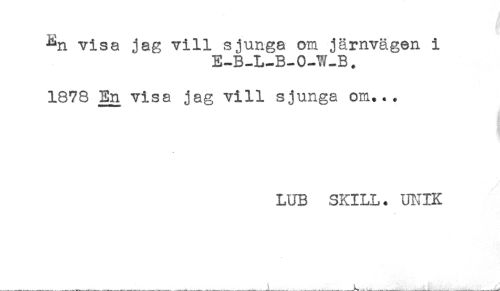 //// ^n visa jag vill sjunga om järnvägen i //// E-B-L-B-O-W-B, //// 1878 En visa jag vill sjunga om... //// LUB SKILL. UNIK //// * ////