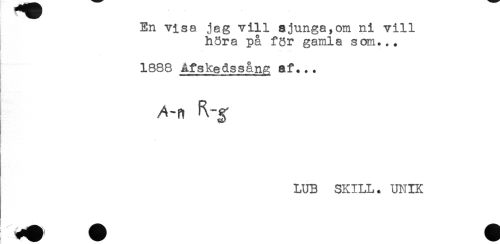 //// En visa jag vill ajunga,om ni vill //// höra på för gamla som... //// 1888 Afskedss&ng af... //// /t-n H-g' //// LUB SKILL. UNIK ////