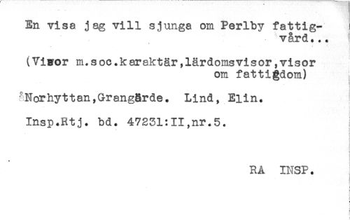 //// En visa jag vill sjunga om Perlby fattig- //// vård... //// * //// ) //// (Visor m.s oo.k araktär,lärdomsvis or,visor //// om fattigdom) //// RNorhyttan,Grang8rde. Lind, Elin. //// Insp.Rtj. bd. 47231:11,nr.5. //// < //// RA INSP. //// s- //// f ////