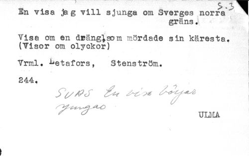 //// En visa jag vill sjunga om Sverges norra ' ^ //// gräns. //// Visa om en dsäng^s^m mördade sin käresta. , //// (Yisor om olyckor) { //// Vrml. Metafors, Stenström. //// 244. , //// ULMA ////