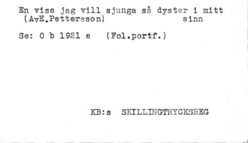//// Rn vise jag vill sjunga sa dyster i mitt //// (AvE.Pettersson) sinn //// Se: 0 b 1921 a (Fol.portf.) //// < //// KB:s SKILLINGTRYCKSREG //// __....... ...... ....... ....- . . .-J ////