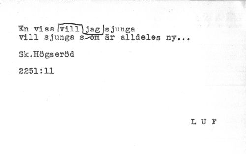 //// En visa ivillYjag jsjunga //// vill sjunga s^om är alldeles ny... //// Sk.Högseröd //// 2251:11 //// L U F ////