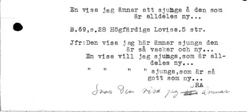 //// En visa jag ämnar att sjuhga å den som //// är alldeles ny... //// ^ B.69,s.28 Högfärdiga Lovisa.5 str. //// * //// - //// Jfr:Den visa jag här ämnar sjunga den //// är så vacker och ny... //// En visa vill jag sjuhga,som är all- //// deles ny... //// " " " " sjunga,som är sa //// gott som ny... ////