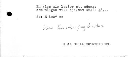 //// En visa mig lyster att sjunga //// I som mången till hjärtat skall gå... //// Se: E 1907 ee //// T .. //// t //// . //// KB:s SKILLINGTRYCKSREG. ////