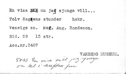 //// En visa nu ja^ sjunga vill... //// Tolv daggens stunder hskr. //// Vessige sn. Reg. Åug. Bondeson. //// Sid. 29 13 str. //// Åcc.nr.3487 //// VARBERG MUSEUM. ////