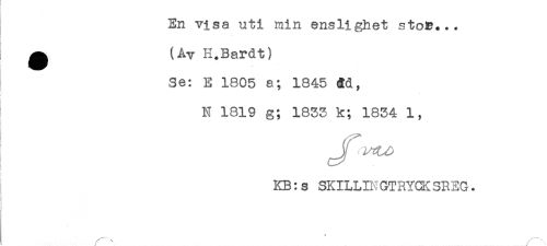 //// En visa uti min enslighet stoB... //// f //// ^ (ÅV H.Bardt) //// Se: E 1805 a; 1845 ad, //// jt * - //// N 1819 g; 1833 k; 1834 1, //// I //// j //// /KB:s SKILLINGTRYCKSREG. //// t ////