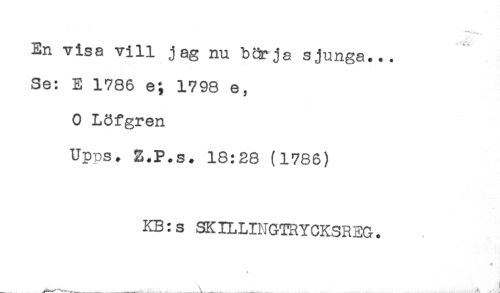 //// En visa vill jag nu börja sjunga... //// Se: E 1786 e; 1798 e, //// O Löfgren //// Upcs. Z.P.s. 18:28 (1786) //// KB:s SKILLINGTRYCKSREG. //// _ . Y a J ////