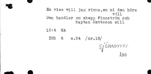 //// En visa vill jag rimma,om ni den böra //// vill //// Den handlar om skepp Finnström och //// kapten Mattsson sill //// 10:4 SÅ //// * //// INR 6 s.24 /nr. 18 //// /ÅBO ////