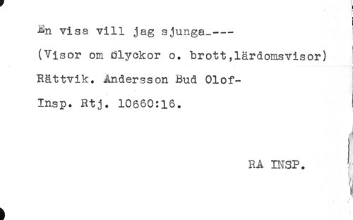 //// } //// § //// En visa vill jag sjunga---- //// < . -* * ^ //// (Visor om olyckor o. brott,lärdomsvisor) //// Rättvik. Andersson Bud Olof- //// + //// Insp. Rtj. 10660:16. //// RA INSP. ////