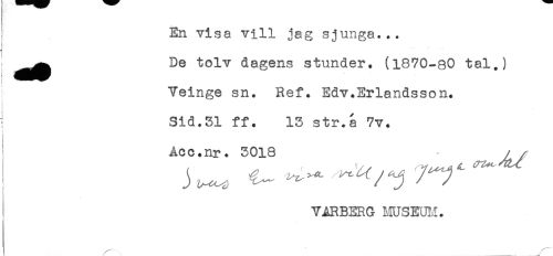 //// En visa vill jag sjunga... //// ! ^ De tolv dagens stunder. (1870-80 tal.) //// Veinge sn. Ref. Edv.Erlandsson. //// Sid.51 ff. 13 str.a 7v. //// j //// Acc.nr. 3018 - //// T^RBSRG MUSEUM. //// / \ ...... . ////