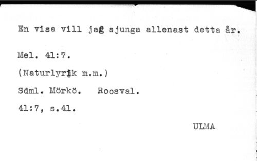 //// T //// En visa vill jag sjunga allenast detta år. //// , i //// ! //// * //// Mel. 41:7. //// #<< ' //// (Naturlyrik m.m.) } //// - //// Sdml. Mörkö. Roosval. //// t //// 41:7, s.41. //// i //// ULMA //// t' //// i //// ! //// i- //// ^ //// i //// * //// ! ////