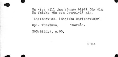 //// En visa vill jag sjunga bl&tt för dig //// Du falska vän,som övergivit mig. //// Kärlekavisa. (Enstaka kärleksvisor) //// Upl. Torstunå, Thorsen. //// 303:814(1), s.90. //// * ////