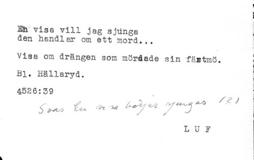 //// t //// H //// i //// H //// Eh visa vill jag sjunga //// den handlar om ett mord... : //// r //// Visa om drängen som mördade sin fästmö. < //// Bl. Hällaryd. //// 4526:39 ' //// i //// t ////