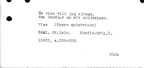//// S' //// En visa vill jag sjunga, //// ^ den handlar om ett skojarpack. //// Visa (Nyare skämtvisor) //// Sdml. St.Halm. Nordin-Grip,I. //// 10922, s.636-638. //// L.. . .. . ////