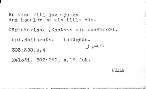 //// i //// i //// ! //// < //// En visa vill jag sjunga, ! //// den handlar om min lilla vän. //// i //// Kärleksvisa. (Enstaka kärleksvisor). //// Upl.Balingsta. Lundgren. //// 303:295,s.4 ^ //// Melodi. 303:290, s.19 foå. ////