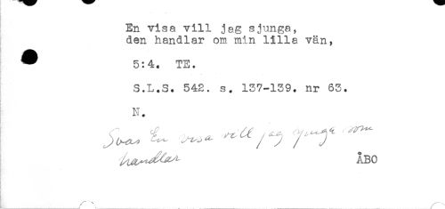 //// En visa vill jag sjunga, //// den handlar om min lilla vän, //// ^ 5:4. TE. //// S.L.S. 542. s. 137-139. nr 63. //// N. //// ^^^^ ABO ////