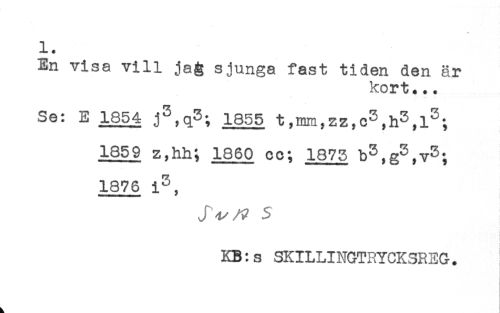 //// 1. //// En visa vill ja& sjunga fast tiden den är //// kort... //// Se: E j3,q3; 1855 t,mm,zz,c3,h3,i3; //// 1859 z,hh; 1860 cc; 1873 b3,g3,y3. //// 1876 i3, //// J^A? 3 //// KB:s SKILLINGTRYCKSREG. ////