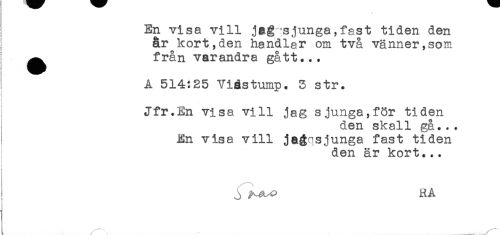 //// En visa vill jag'sjunga,fast tiden den //// år kort,den handlar om två vänner,som //// ^ från varandra gått... //// A 514:25 Viåstump. 3 str. //// Jfr.En visa vill jag sjunga,för tiden //// den skall gå... //// ! En visa vill jagqsjunga fast tiden //// den är kort... //// j ^^ RA //// c //// i . .....v""' ////