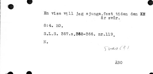 //// En visa vill jag sjunga,fast tiden den XX //// är svår. //// . * - - //// 8:4. HO. //// S.L.S. 367.s.362-366. nr.119, //// N. //// ÅBO ////