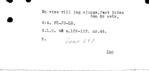 //// En visa vill jag sjunga,fast tiden //// ^ den är svår, //// 6:4. FÖ-JO-LE. //// S.L.S. 46 s.132-133. nr.46. //// N. . ^ y //// ÅBO ////