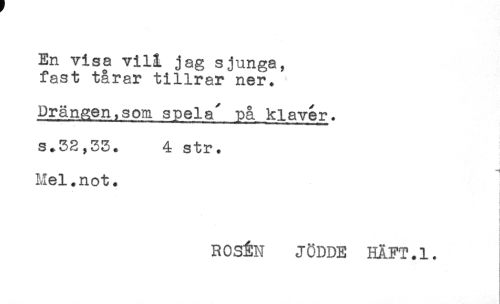 //// En visa vill jag sjunga, //// fast tårar tillrar ner. //// Drängen,som spela^ på klaver. //// s.33,33. 4 str. //// Mel.not. //// ROSÉN JODDE HÅFT.l. ////