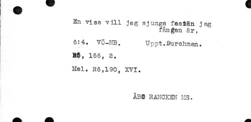 //// < //// En visa vill jag sjunga fastän jag //// fången är, //// 6:4. VÖ-NB. Uppt.Durchman. //// B6, 166, 2. //// Mel. R6,190, XVI. //// E- //// ÅBO RANCKEN MS. ////