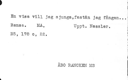 //// ! //// En visa vill jag sjunga,fastän jag fången... //// Ramsa. MA. Uppt. Nessler. i //// R5, 178 c, 32. ! //// E //// H //// E //// * //// f- //// ÅBO RANCKEN MS //// ! //// r* //// ' f ////