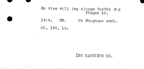 //// En visa vill jag sjunga fastän jag //// fången är, //// ^ 14:4. SB. Ur Skogmans saml. //// R5, 168, 19. //// ÅBO RANCKENS MS. //// - - - '.....'. ___ ^ ___ _ _ , _ _____ _____ ////