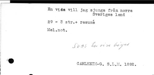 //// ! ' * //// En vi ås vill jag sjunga från norra //// Sveriges land //// ; //// 29-3 str.+ resumé //// i //// ) //// Mel.not. //// ! //// ^ CARLHEIM-G. S.L.H. 1892. ////
