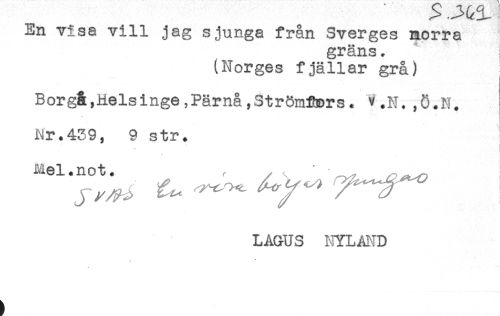 //// En visa vill jag sjunga från Sverges morra //// gräns. //// (Norges fjällar grå) //// Borgå,Helsinge,Pärnå,Ström^rs. v.N. ,0.N. //// Nr.439, 9 str. //// s i //// Mel.not. , / \ * //// J ^ ^ ^^ ^^ //// LAGUS HYLAID //// * ////