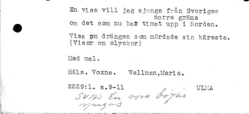//// i En visa vill jag sjunga från Sveriges //// I norra gräns //// ^ om det som nu hat timat upp i Norden. //// Visa pm drängen som mördade sin käresta. //// (Visor om olyckor) //// Med mel. //// Häls. Voxna. Wallman,Maria. //// I 2239:1. s.9-11 , ^ . UL1IA ////