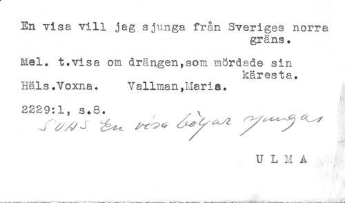 //// En visa vill jag sjunga från Sveriges norra //// gräns. //// Mel. t.visa om drängen,som mördade sin //// käresta. //// Häls.Voxna. Vallman,Maria. //// 2229:1, s+8. //// , ^ v- ^ ^^ , ////