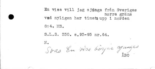 //// ! En visa vill jag sjunga från Sveriges //// j ^ norra gräns //// * vad nyligen har timatsupp i norden //// ! //// 8:4. MS. //// ! .* t //// S.L.S. 330. s.93-95 nr.64. //// N. //// ! ' ÅBO "' //// ^' ...... /...... ////