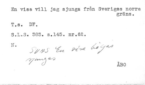 //// En visa vill jag sjunga från Sveriges norra //// gräns. //// T.s. DF. //// S.L.S. 383. s+145. nr.62. //// * //// ^ ABO ////