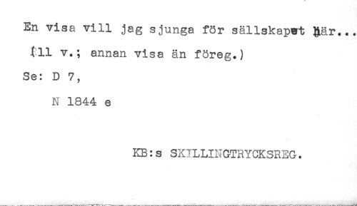 //// En visa vill jag sjunga för sällskapet &är... //// (11 v.; annan visa än föreg.) //// Se: D 7, //// N 1844 e //// KB:s SKILLINGTRYCKSREG. ////