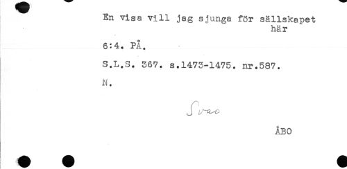 //// En visa vill jag sjunga för sällskapet //// här //// -r //// 6:4. PÅ. //// S.L.S. 567. s.1473-1475. nr.587. //// N. //// ÅBO ////