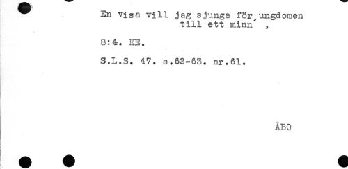 //// ^ En visa vill jag sjunga för,ungdomen //// till ett minn' , //// 8:4. EE. //// ' ' ** - //// S.L.S. 47. s.62-63. nr.61. //// ÅBO //// t. //// c //// I //// H H n § § ////